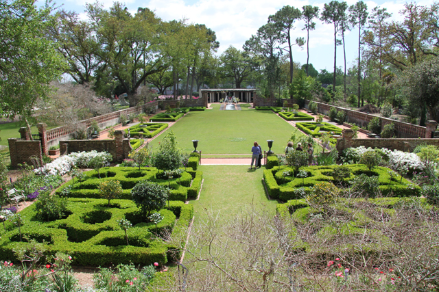 The gardens of Longue Vue complement the splendor of Spanish Court, inspired by the Gardens of the Alhambra in Spain. The array of lyrical fountains shooting arches upward across a long rectangular pool with the mansion in the background are perhaps the most stunning features of the estate and probably the most photographed. Most of the gardens that Shipman designed for the Sterns are still intact today or have been recently restored using the original Shipman plans.