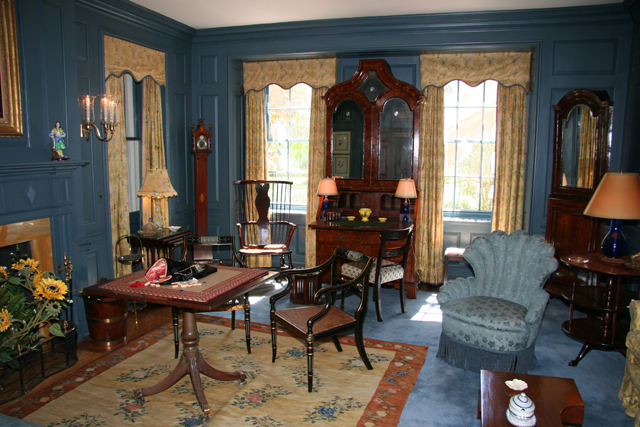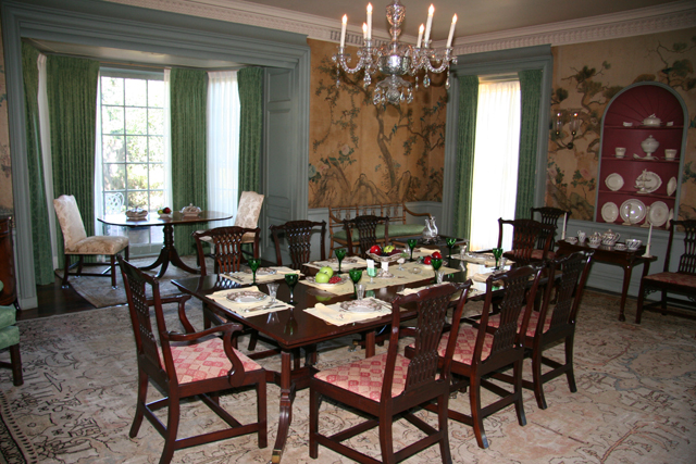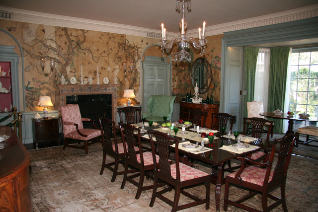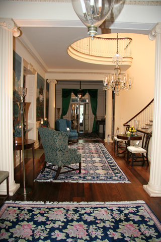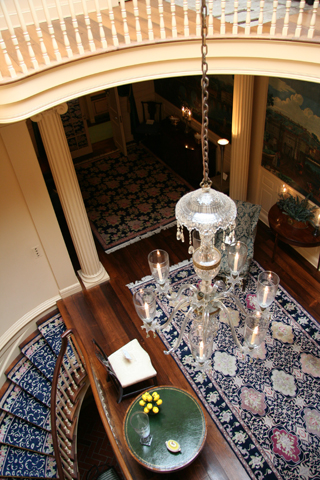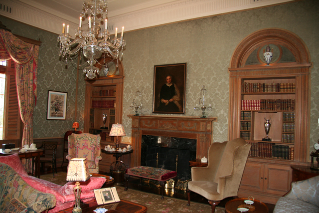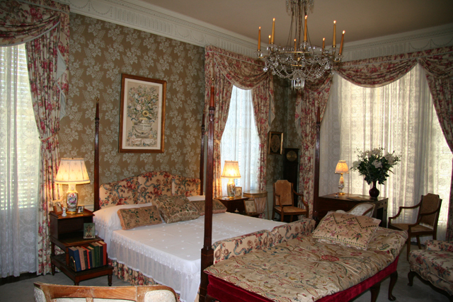 A graceful stairway framed by shining white Doric columns leads to the upper stories where the Sterns maintained elaborately furnished bedrooms. In another room is a collection of architectural and landscaping memorabilia, including early plans for the house and gardens