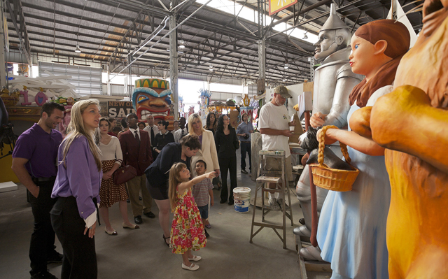 During the tour, visitors learn about the many traditions surrounding Mardi Gras parades, balls and music, as well as the intricacies of float designing and building. Mardi Gras floats began rumbling down New Orleans streets in 1837 with mule-drawn carriages. Today the tradition continues with sophisticated mega-floats, which hold more than 200 masked riders and are lit with fiber optic cables and laser lights.