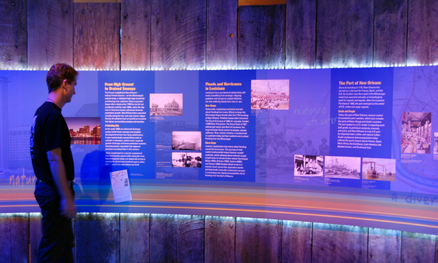 Gallery Four celebrates recovery and promotes preparedness and showcases the ingenuity of Louisianans in rebuilding their lives and communities. The gallery will be updated regularly to reflect advancements in flood protection and coastal restoration and new strategies for living with hurricanes.
