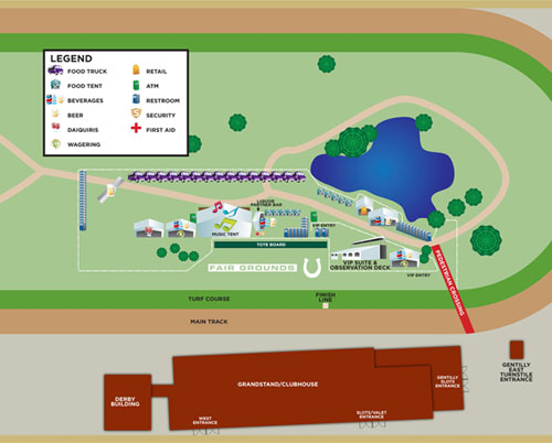 The festival will be taking place as the races are going on and attendees will have access to the infield via a bridge that will span the track between the finish line and the first turn. Crossings will be allowed between the individual races. The event will occupy a portion of the infield opposite the grandstands and clubhouse and adjacent to the infield pond. The music tent will be placed behind the tote board and festival attendees are encouraged to bring lawn chairs and blankets.